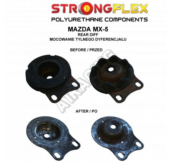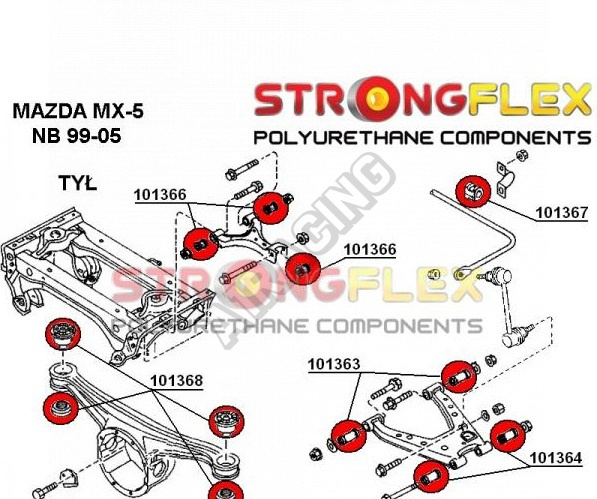 Mazda MX5 1999-05 StrongFlex (tvrdost 80ShA) kompletní sestava silentbloků na celé auto obsahuje :