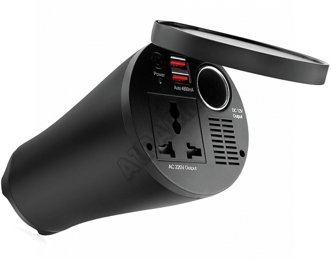 Měnič napětí ve tvaru do otvoru pro nápoje. Převádí stejnosměrný 12V proud na střídavý proud 230V s upraveným sinusem. Má 2 USB výstupy pro napájení 5V zařízení.