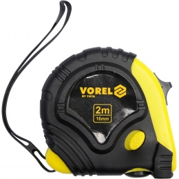 Svinovací metr 2 m dlouhý a 16 mm široký zakončený pohyblivým háčkem. Pouzdro je vyrobeno z plastu, vyztuženo gumovými podložkami a aretačním knoflíkem.