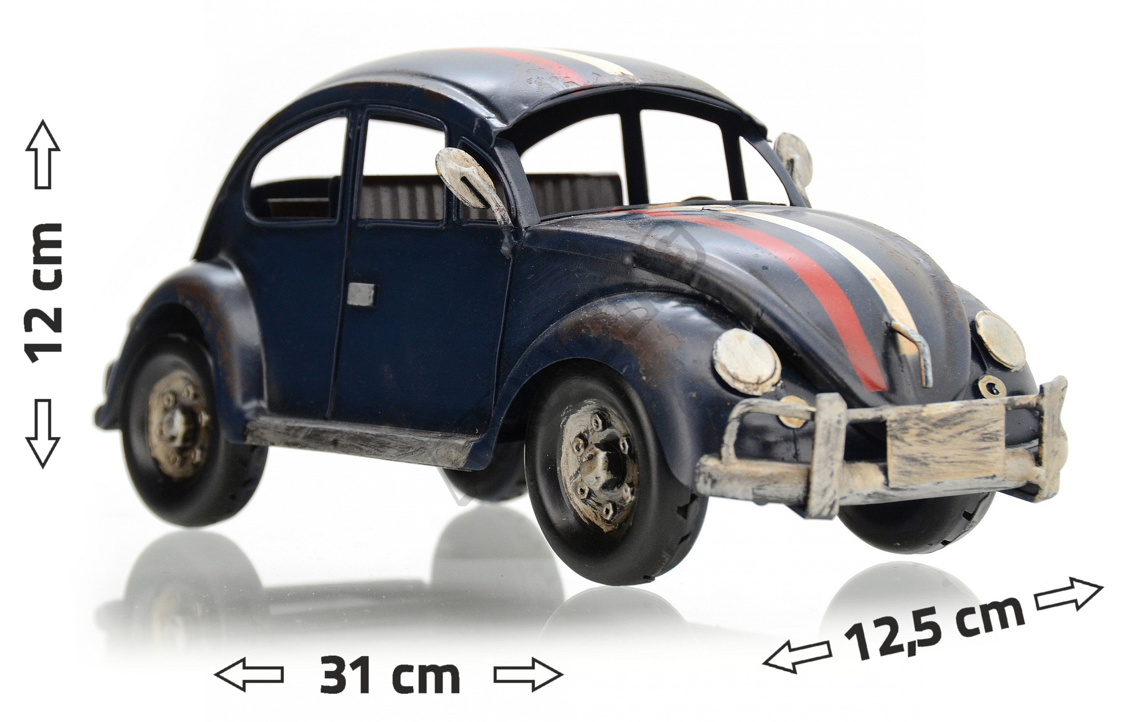 Dekorační model vozidla typu brouk v měřítku přibližně 1:13, s patinou a opotřebovaným vzhledem.