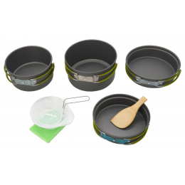 Sada outdoorového nádobí v provedení z anodizovaného hliníku.