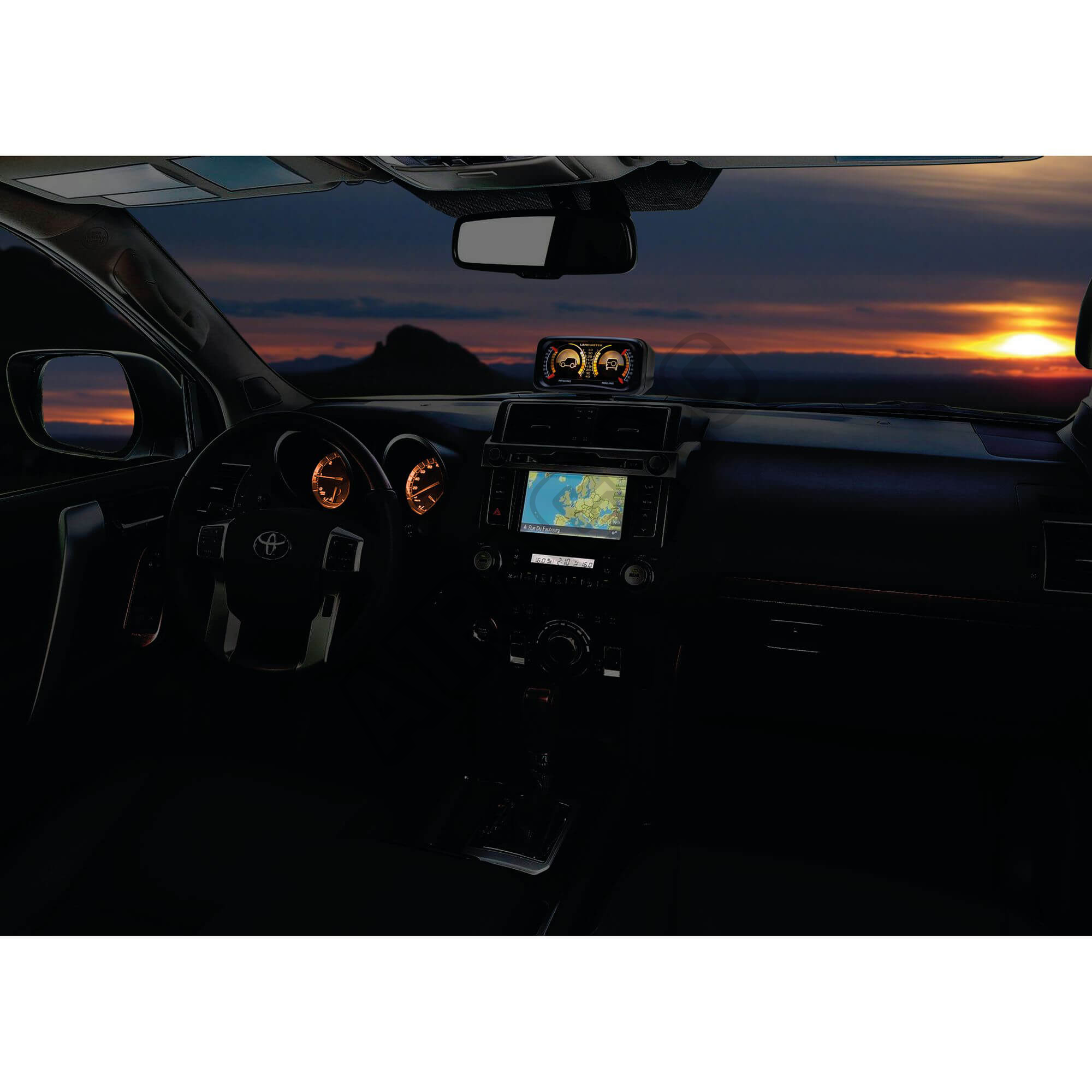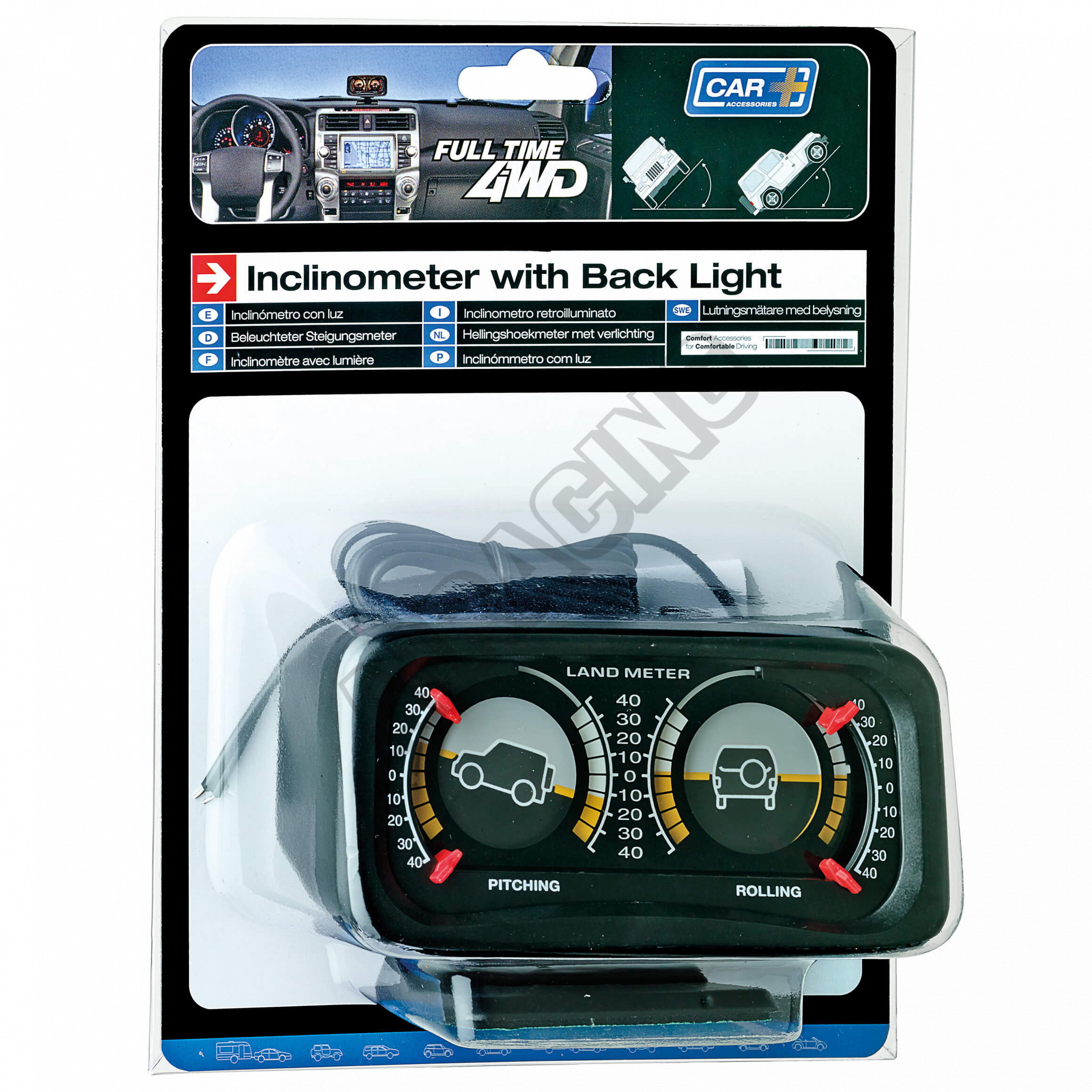 Slouží k měrění podélného a příčného náklonu vozidla. Podsvětlený. Vybaven zástrčkou do zásuvky auto zapalovače nebo je zde možnost napojit přímo na el. vedení. Napájení 12V. Velikost 12 x 6 cm
