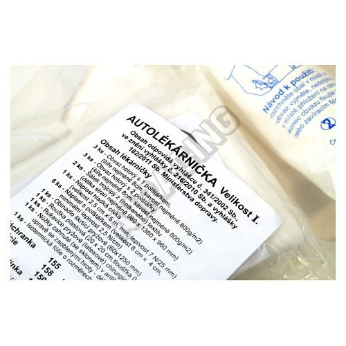 Náhradní náplň pro autolékárničku vel. I. Obsah odpovídá vyhlášce č. 341/2002 sb., ve znění vyhlášky č. 216/2010 Sb., a vyhlášky 182/2011 Sb. Ministerstva dopravy ČR.