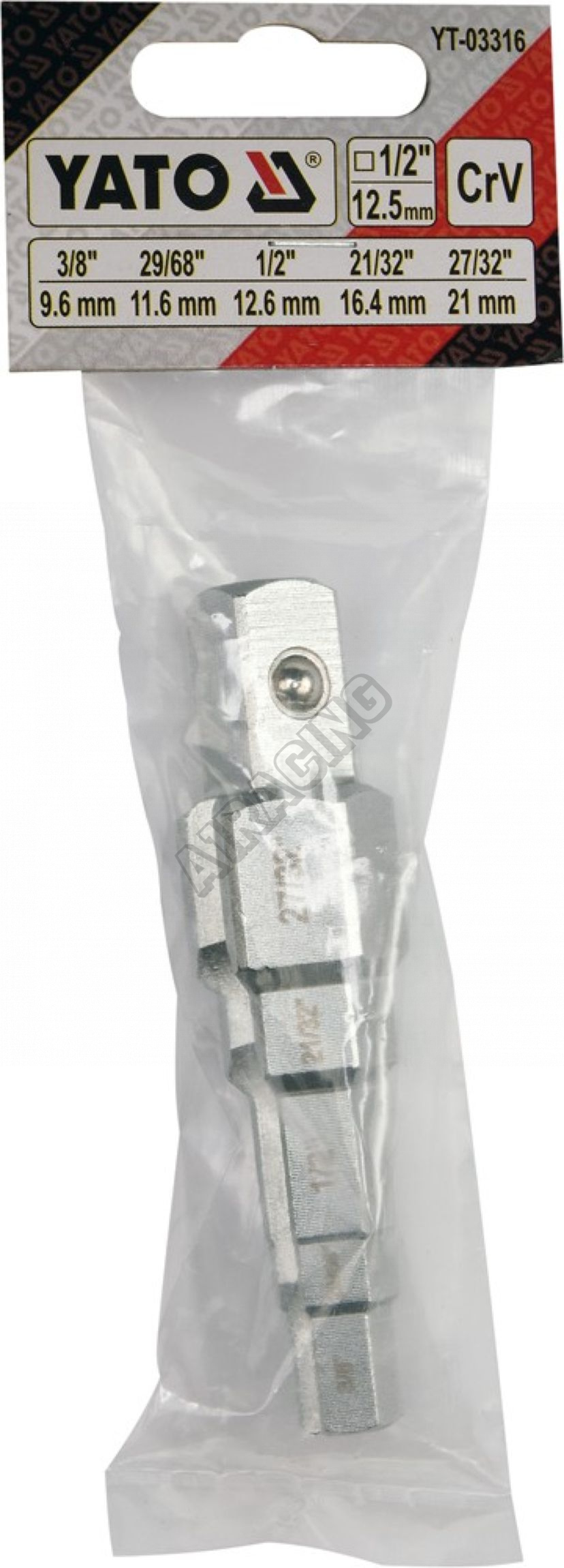 Rozměry postupného nástavce 3/8" - 29/68" - 1/2" - 21/32" - 27/38" se zakončením 1/2".