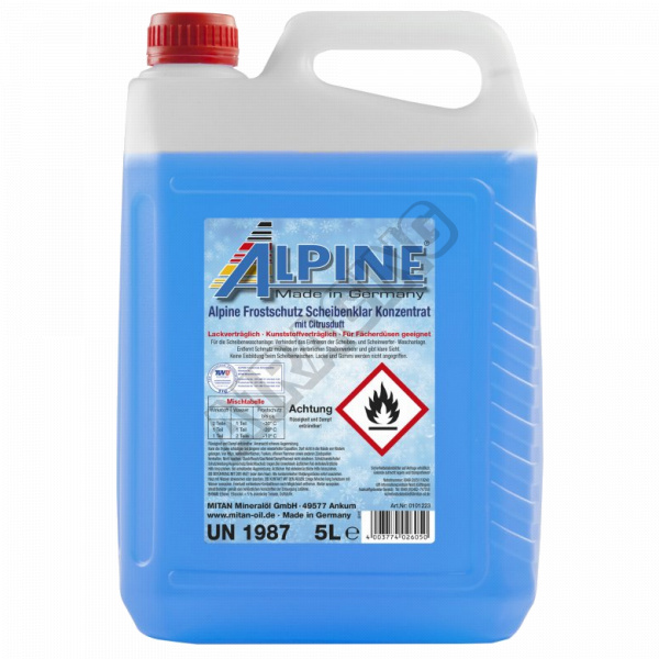 Profesionální celoroční nemrznoucí kapalina do ostřikovačů skel německé firmy Alpine (silně neředěný koncentrát na -50°C). Odstraňuje hmyz, mastnoty a jiné nečistoty ze skla. Nepoškozuje autolak ani gumy (stěrače, těsnění). Ředění pro zimní období: -30°C (2:1 s vodou), -20°C (1:1 s vodou), -10°C (1:2 s vodou). Ředění v létě: 50-100ml koncentrátu na 1L vody. Neobsahuje metanol ani jiné jedovaté látky.