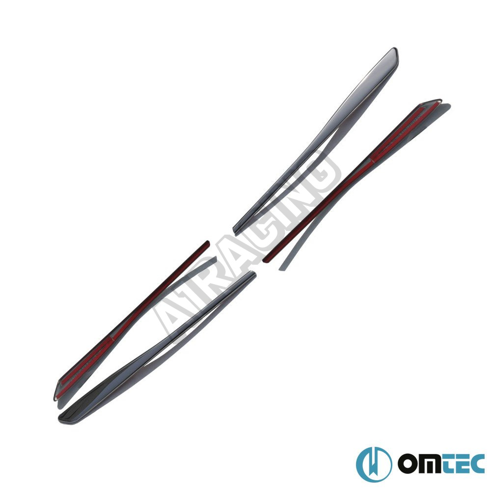 Pozor : Každý tento díl se musí lepit aspoň při teplotě 10 °C, kde před instalací musí být lepená část naprosto čistá a suchá, aby vnitřní polep se perfektně uchytil. Pokud chcete maximalizovat uchycení. Můžete na několika místech bodově přidat 2-složkové lepidlo na kov/plast. Výsledkem bude pevné spojení, které už nepovolí - ale není to podmínkou, dobře očištěný a nalepený díl jen na oboustranné pásky jde velmi těžko sundat. Proto je dobré hned na poprvé daný díl dobře přesně nasadit.