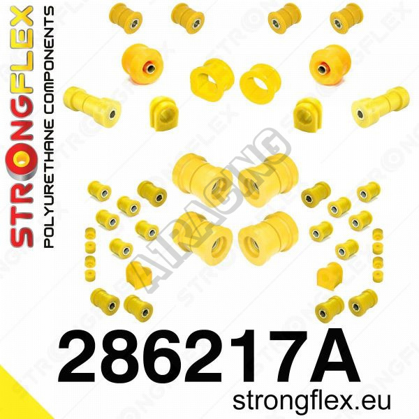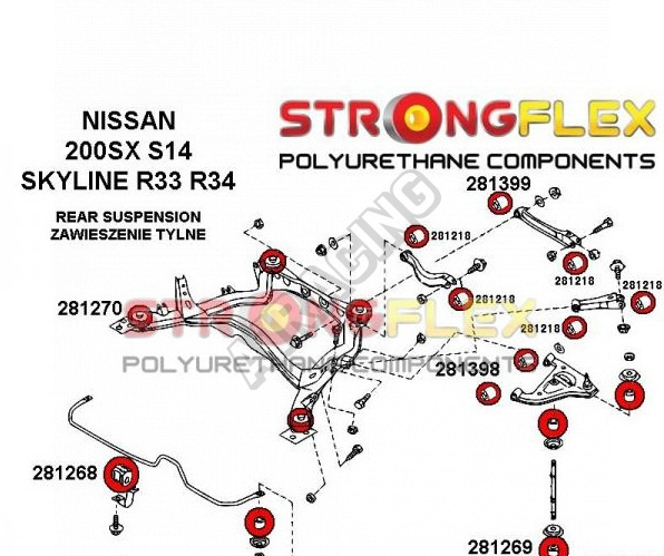 Nissan Skyline R34 StrongFlex Sport (tvrdost 90ShA) kompletní sestava silentbloků na celé auto obsahuje :
