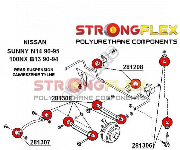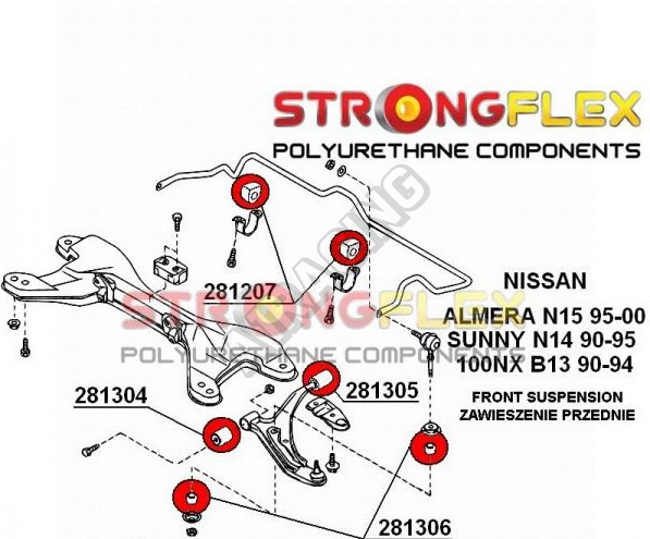 Nissan Sunny StrongFlex (tvrdost 80ShA) kompletní sestava silentbloků na celé auto obsahuje :