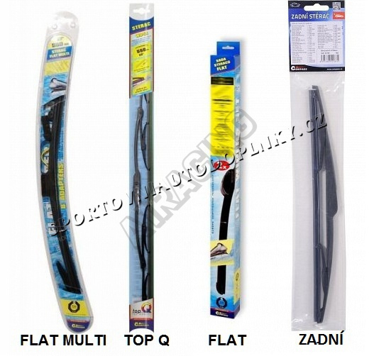 Stěrače FLAT SET (sada 2 ks na celé auto). Vysoce kvalitní pružný člen plochého stěrače zajišťuje stejnoměrný tlak grafitového břitu v celé jeho délce, což zamezuje rozmazávání nečistot a vytváření pruhů.