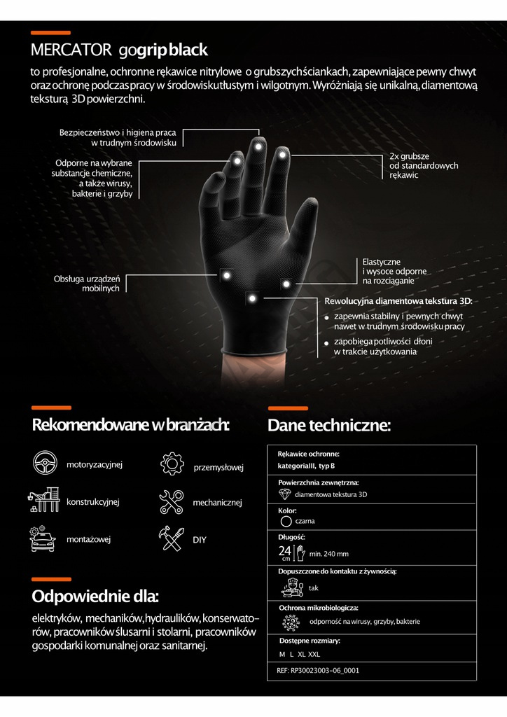 Jsou 3krát silnější než standardní rukavice dostupné na trhu. Byly vyrobeny z odolného nitrilu. Vyznačují se vysokou flexibilitou, vysokou odolností proti roztažení a unikátní diamantovou 3D texturou, která zajišťuje, že úchop je pevný a stabilní, aniž by omezoval přesnost. Originální struktura MERCATOR® gogrip umožňuje ovládat mobilní zařízení bez sundávání rukavic a zabraňuje pocení rukou během používání, což zvyšuje komfort práce, minimalizuje riziko poškození kůže rukou.