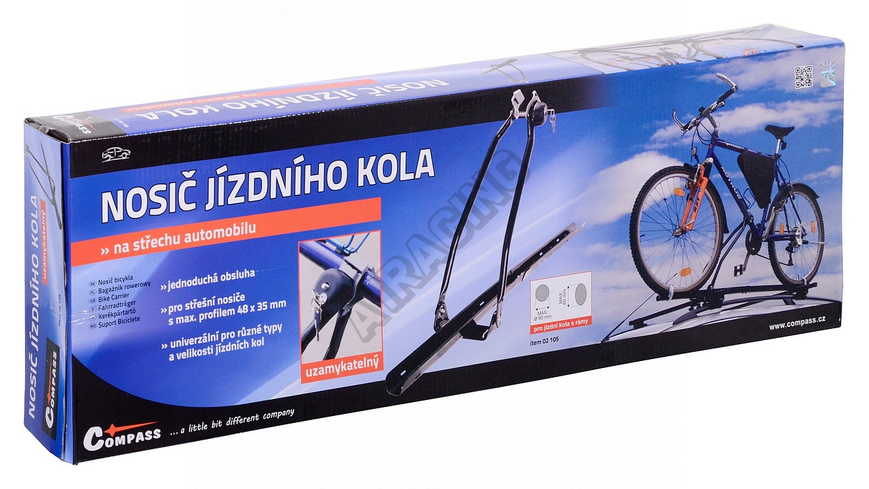 Střešní nosič jízdního kola, určeno pro automobily s namontovaným střešním nosičem.