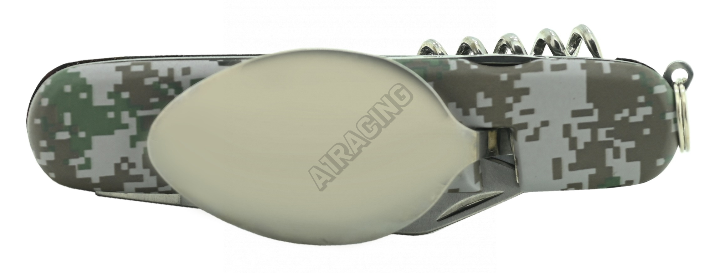 První část obsahuje vidličku, otvírák na plechovky, otvírák na lahve a vývrtku. Druhá část nabízí lžíci, úderník a samotnou čepel nože. Všechny nástroje jsou vyrobeny z nerezové oceli, která zaručuje dlouhou životnost a odolnost vůči korozi.