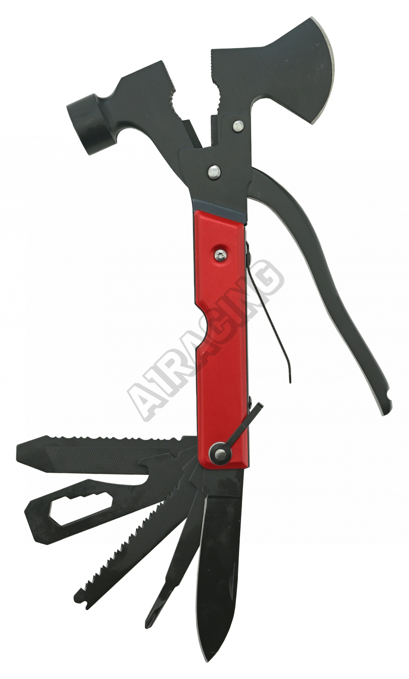 Nejvýraznějšími částmi jsou kladivo a sekyrka. Po rozepnutí pojistky na konci rukojeti, se v přední části odhalí čelisti, které mohou být použity jako kombinované kleště. Dále se nabízí klasický nůž délky 7 cm, křížový šroubovák nejběžnějších rozměrů, pilka na dřevo, odstraňovač šupin ryb a pilníkem se zakončením, jenž se dá použít jako plochý šroubobvák. Posledním nástrojem je otvírák, kombinovaný imbusovým nástavcem.