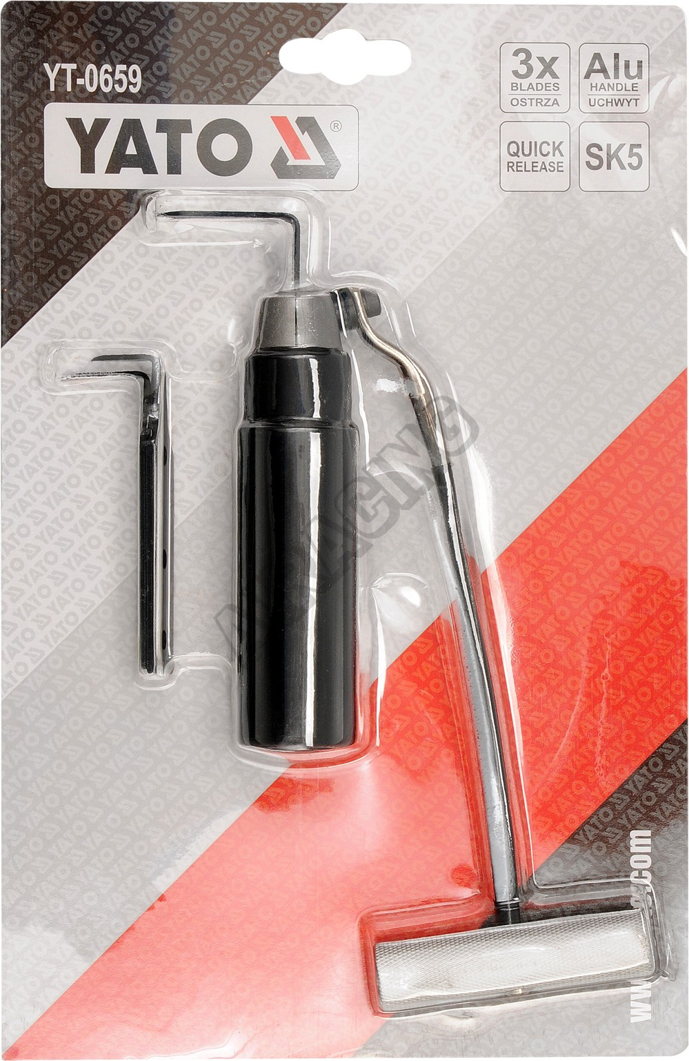 Nůž pro vyřezávání lepených autoskel. Tažením přípravku s čepelí vsazenou pod sklo bezpečně oddělít