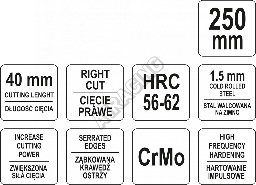 Nůžky pravé, délky 250 mm na plech. Vhodné pro stříhání oceli do tloušťky 1,5 mm. Zhotovené z CrMo
