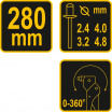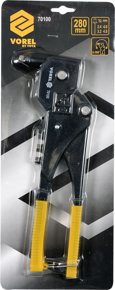 Nýtovací kleště délky 280 mm s otočnou hlavou, pro nýty 2,4 - 4,8 mm.