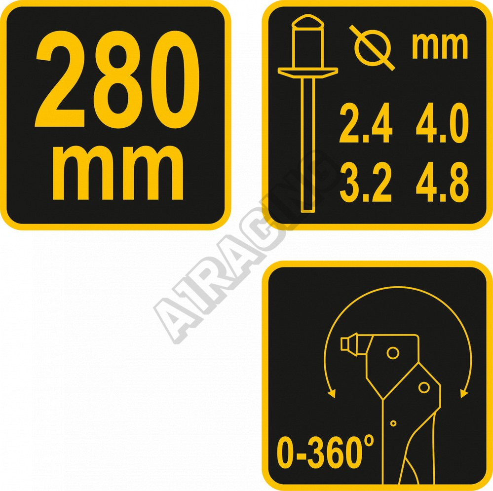 Nýtovací kleště délky 280 mm s otočnou hlavou, pro nýty 2,4 - 4,8 mm. Kleště jsou zhotoveny z alumin
