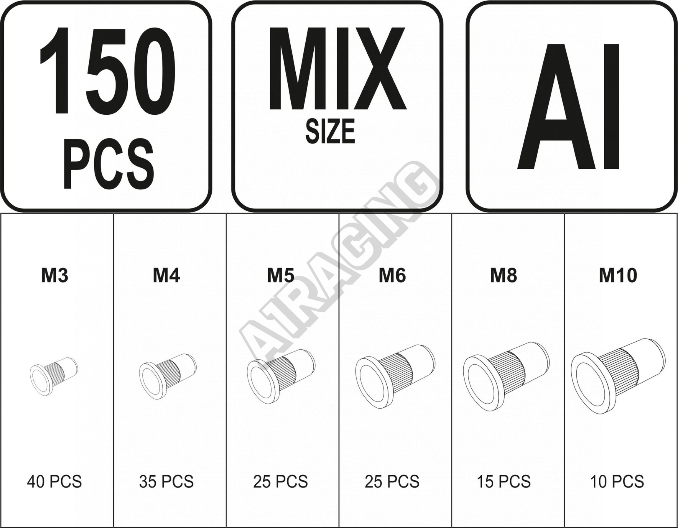 Nýtovací matice hliníková sada150 ks M3-M10