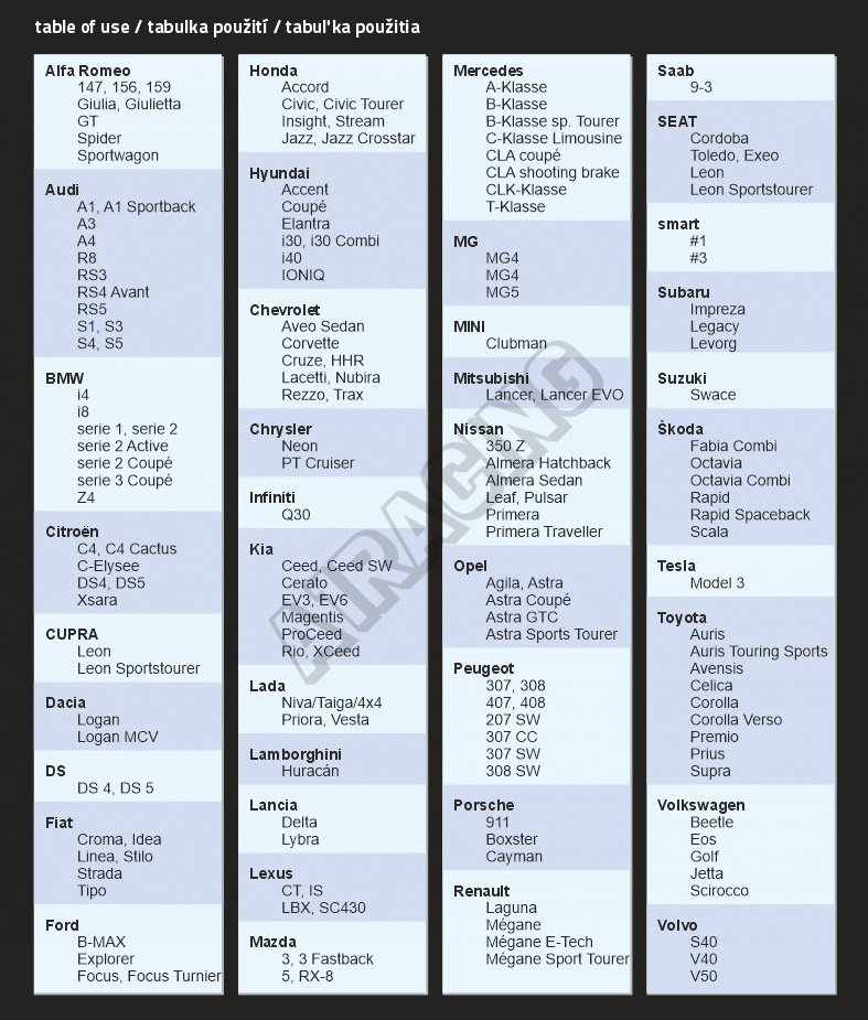 | Škoda | Fabia Combi, Octavia, Octavia Combi, Rapid, Rapid Spaceback, Scala |