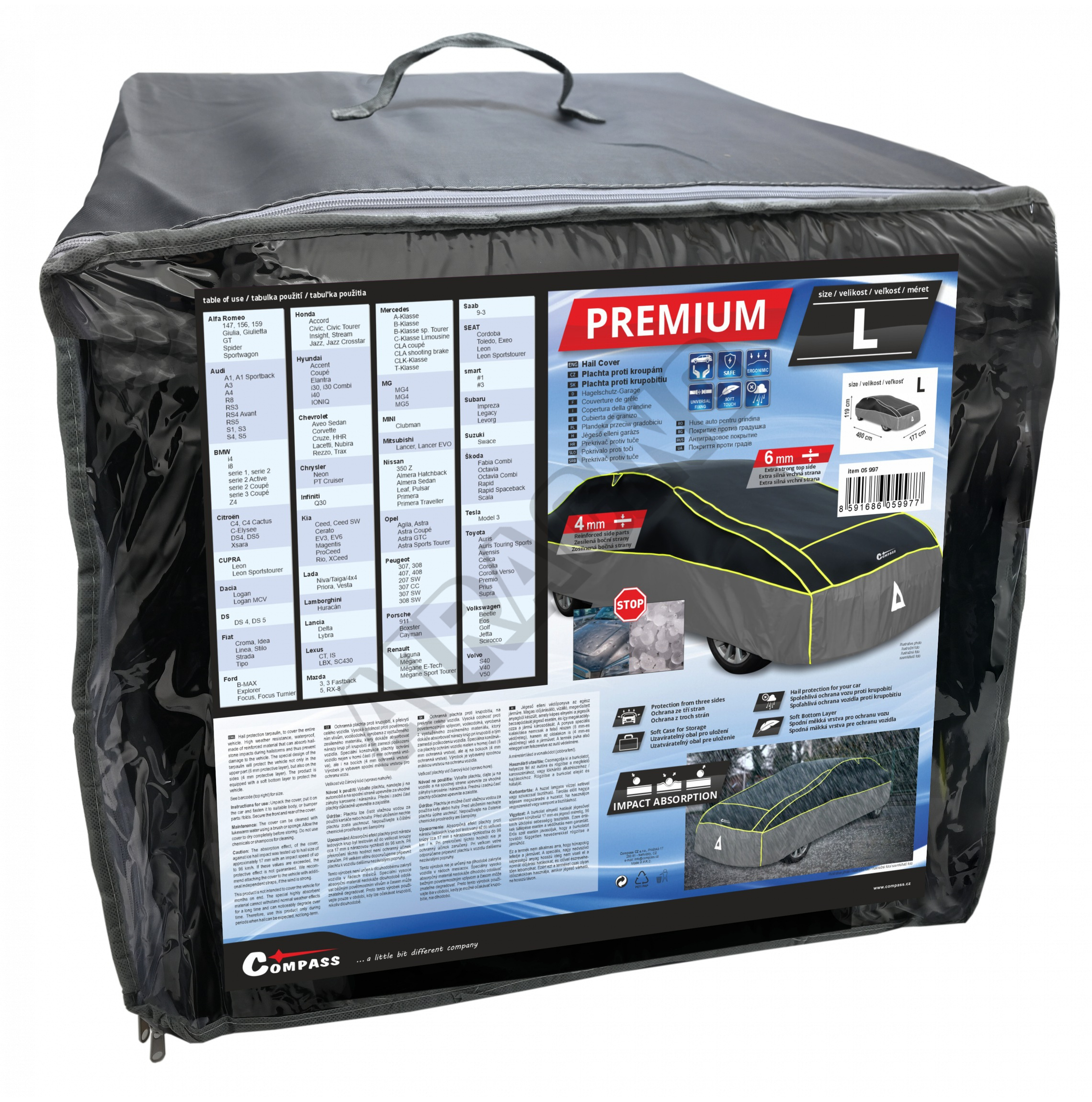 Plachta zajistí maximální ochranu díky své zesílené, vrstvené konstrukci. Horní část je opatřena šestimilimetrovým ochranným polstrováním, které spolehlivě pohlcuje nárazy krup o průměru až 17 mm letících rychlostí 96 km/h.