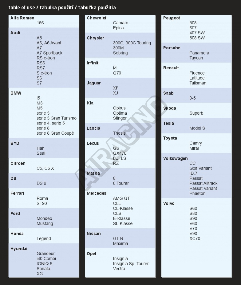 | Opel | Astra Sports Tourer, Insignia, Insignia Sports Tourer, Omega, Omega Sedan, Vectra |