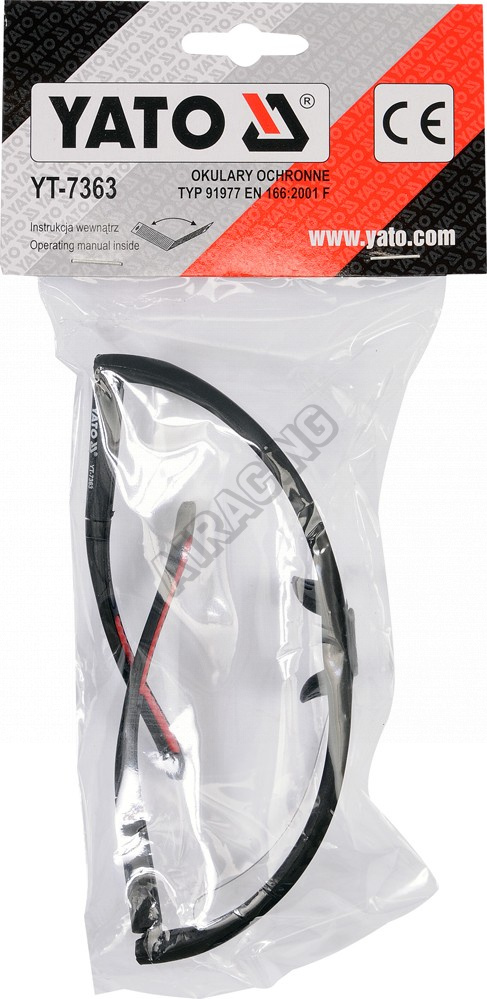 Ochranné brýle z polykarbonátu, s délkově nastavitelnými ramínky, které lze navíc pomocí otvorů na koncích opatřit např. gumičkou pro zavěšení na krk. Dosedací plochy s obličejem jsou pro pohodlnější nošení polstrované.
