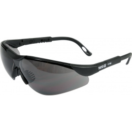 Tmavé ochranné brýle z polykarbonátu, s délkově nastavitelnými ramínky, které lze navíc pomocí otvorů na koncích opatřit např. gumičkou pro zavěšení na krk.