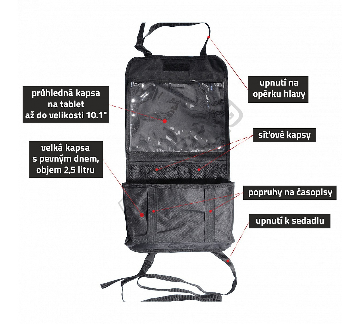 Organizér TABLET s upevněním na zadní stranu předního sedadla, dále pevnění horní části pomocí popruhů za opěrku hlavy, spodní části popruhy za sedadlo.