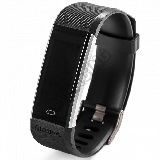 Fitness hodinky černé barvy s brandingem ŠKODA. Funkce: čas, datum, tepová frekvence, krokoměr, kalorie, budík, oznámení SMS/hovoru, monitorování spánku. Hodinky jsou voděodolné. Připojení ke smartphonu (Android, iOS) pomocí Bluetooth. Nabíjení přes integrované USB. Doba nabíjení 1-2 hodiny, pohotovostní režim až 8 dnů.