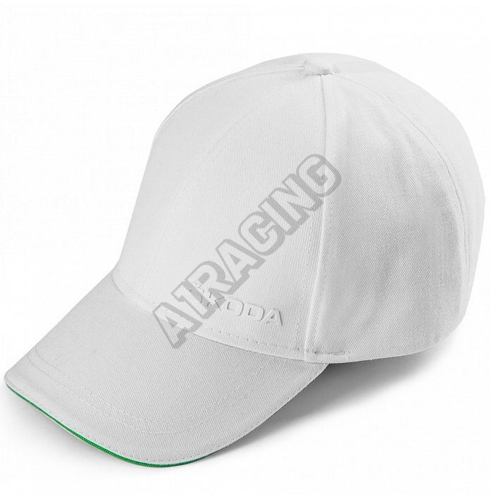 Bílá unisexová kšiltovka s bílým 3D potiskem ŠKODA na přední straně vlevo a s bílou páskou vzadu. Kontrastní okraj kšiltu v zelené barvě ŠKODA.