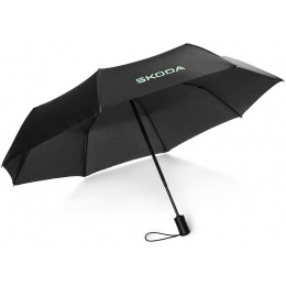 Černý skládací deštník s 8 panely, na jednom panelu aquaprint Škoda (viditelné po navlhčení materiálu), na dalším panelu electric green potisk Škoda o délce 14 cm.