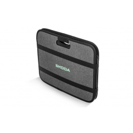 Tmavě šedá skládací přepravka je praktickým doplňkem do kufru vozu. Lze ji jednoduše rozložit a složit. Složenou ji drží dva elastické popruhy. Má pevné omyvatelné dno a uvnitř praktické kapsy ze síťoviny. Na přední straně logo Škoda v Electric green (délka 8cm).