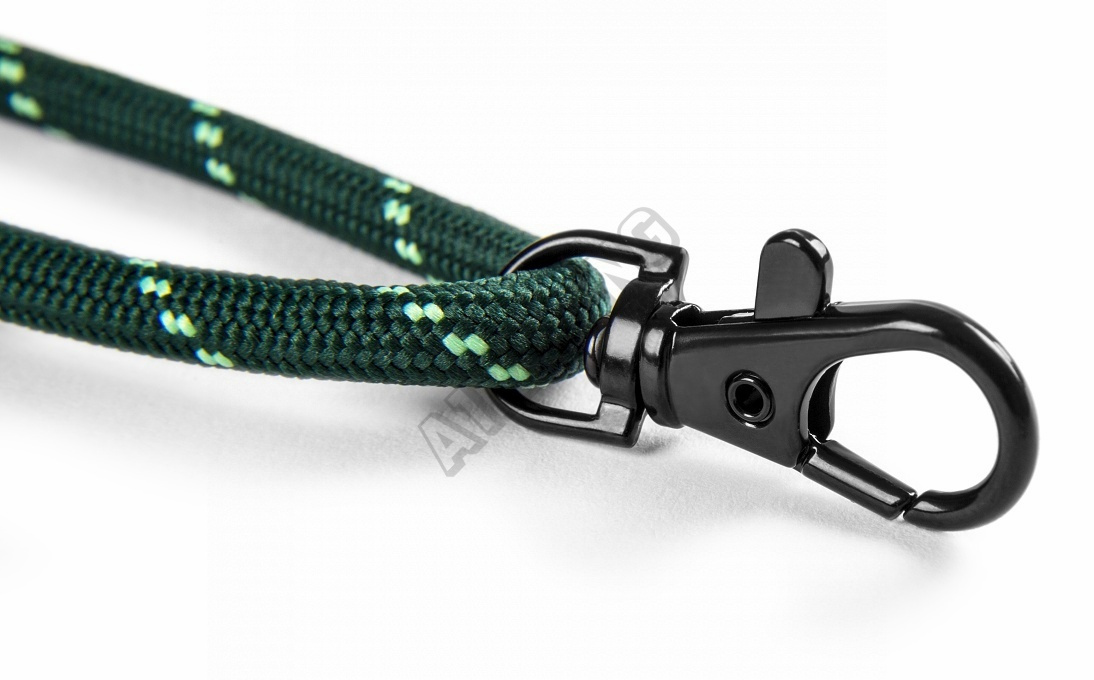 Šnůra na krk v barvě emerald s kovovou sponou a tištěným logem Škoda. Bezpečnostní přeska a kovová karabinka.