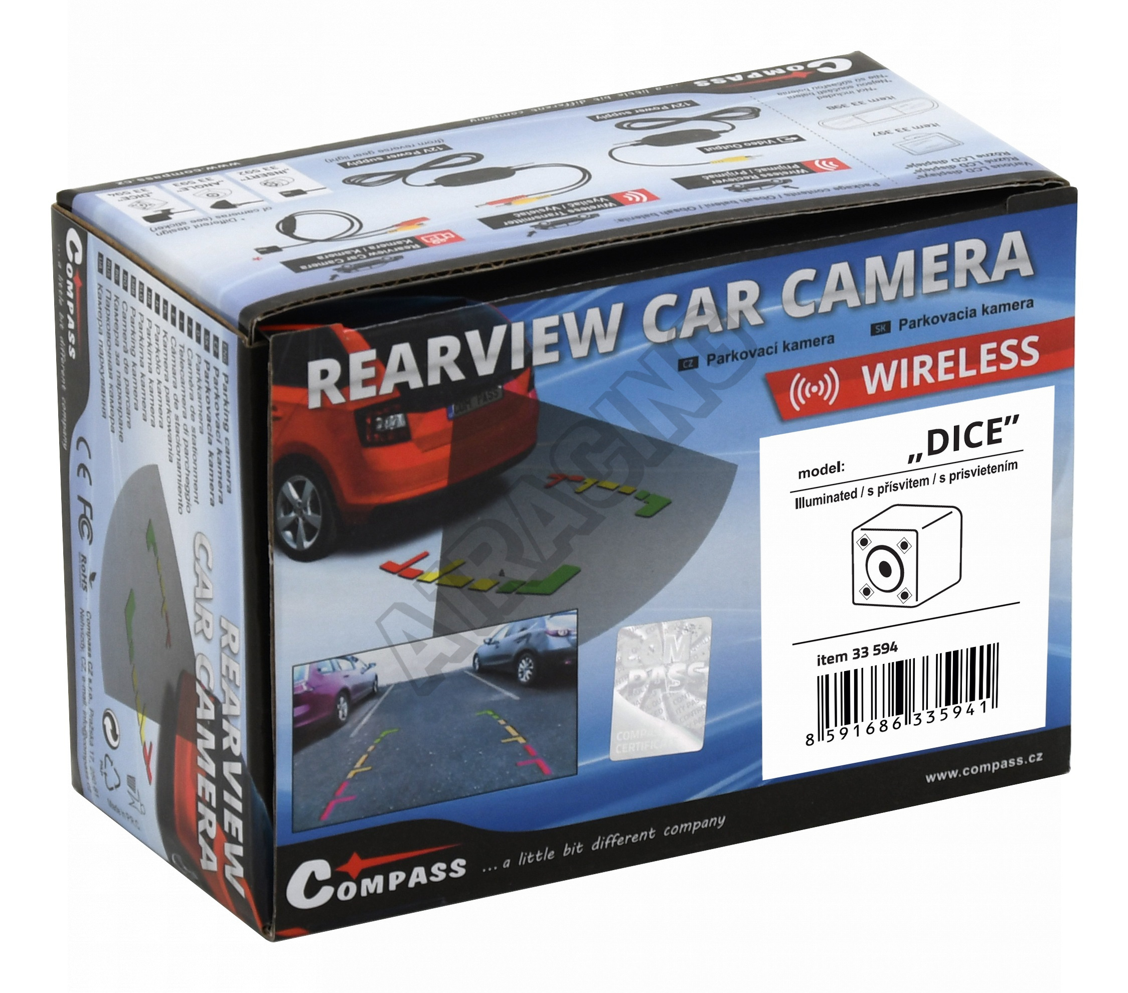 Bezdrátová parkovací kamera s úhlem záběru 120°. Určeno pro montáž na předem určené místo v zadní části vozu.