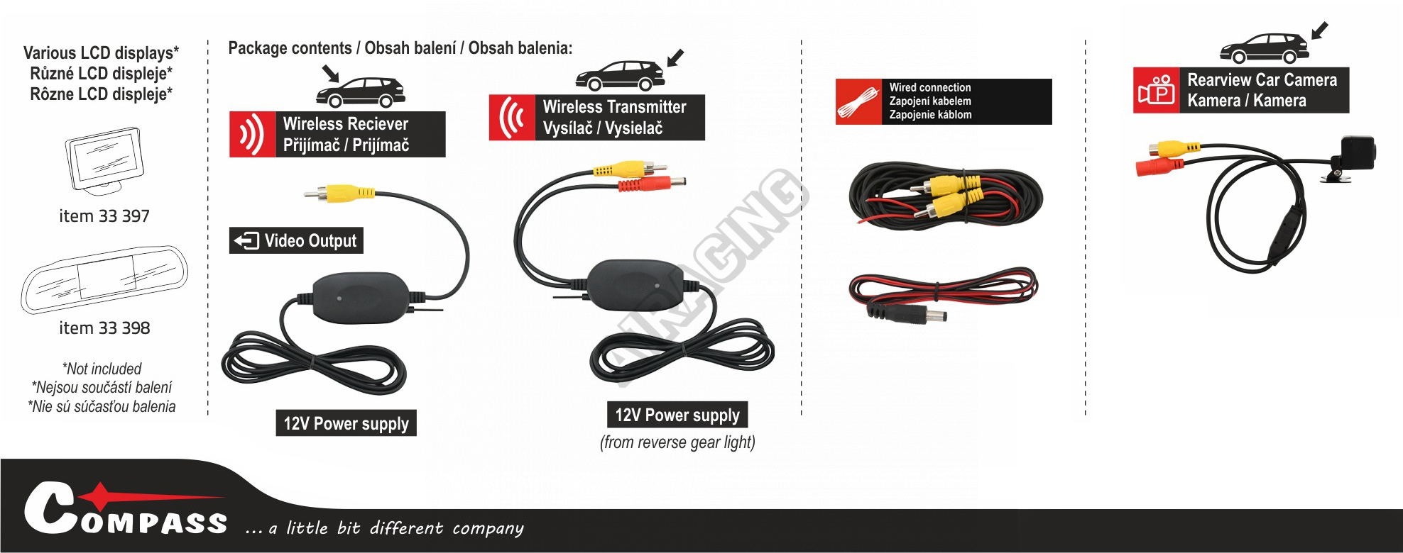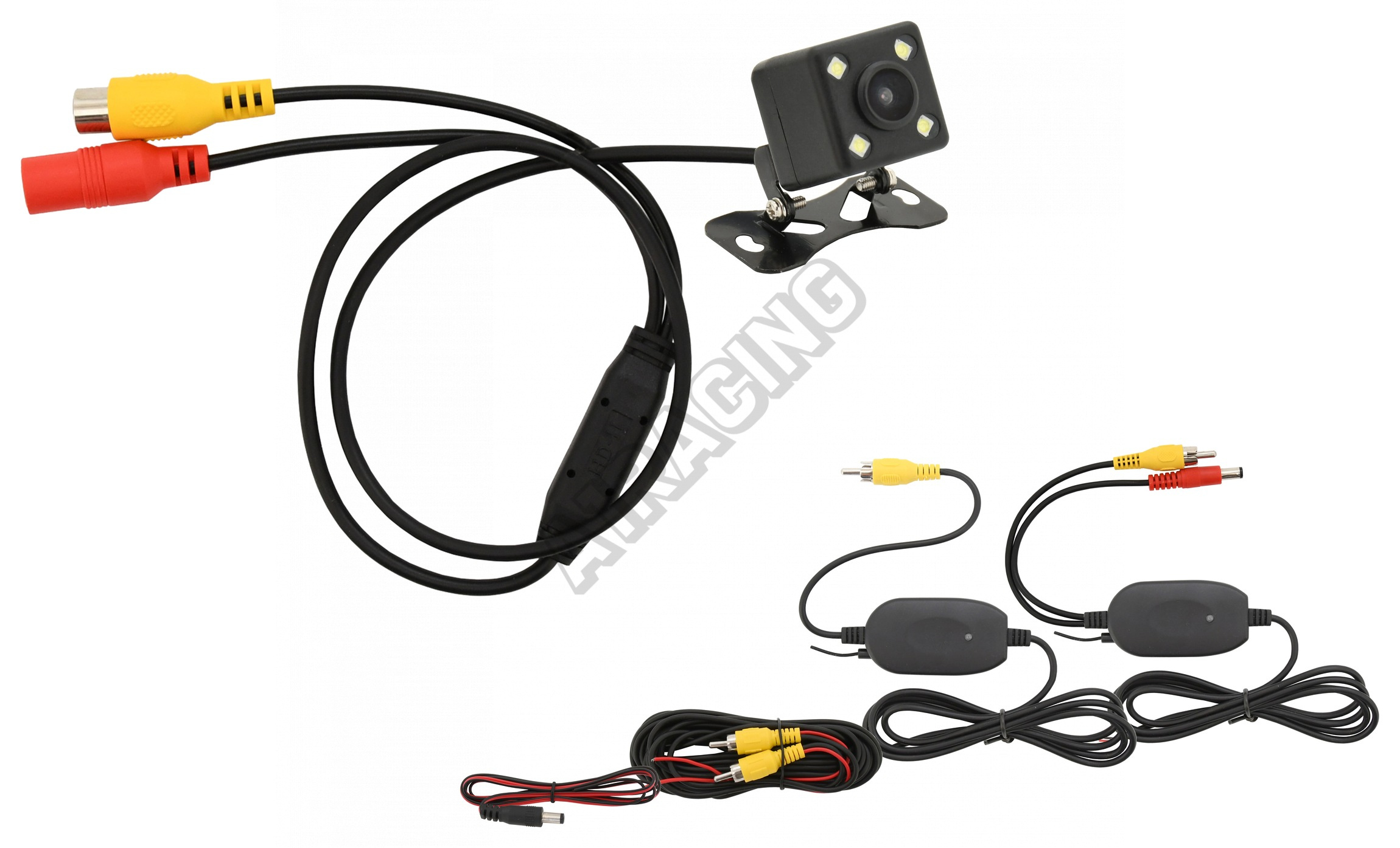 Celá sada je zakončena žlutým cinch konektorem video signálu (RCA), který je možné zapojit do libovolného displeje s video vstupem. V našem sortimentu jsou dostupné různé displeje vhodné pro umístění do auta.