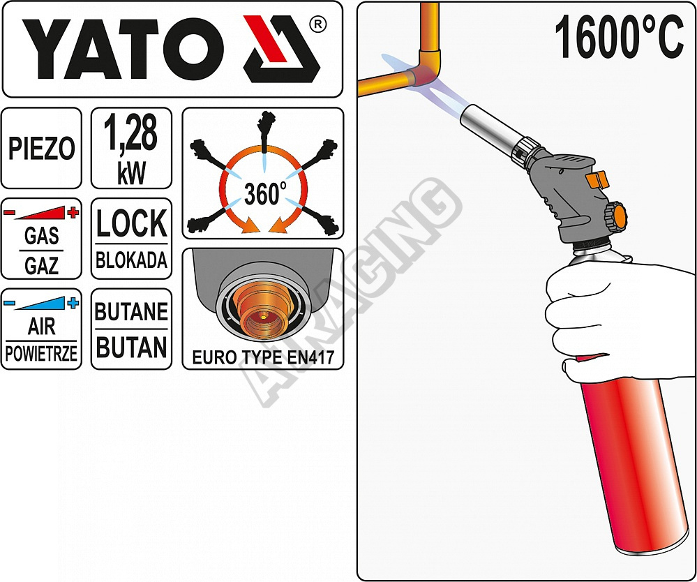 Díky speciální konstrukci, umožňuje práci v libovolné poloze (360°). Hořák má nastavitelný výkon plamene a přívod vzduchu. Je určen pro pájení měkkých a tvrdých měděných trubek.