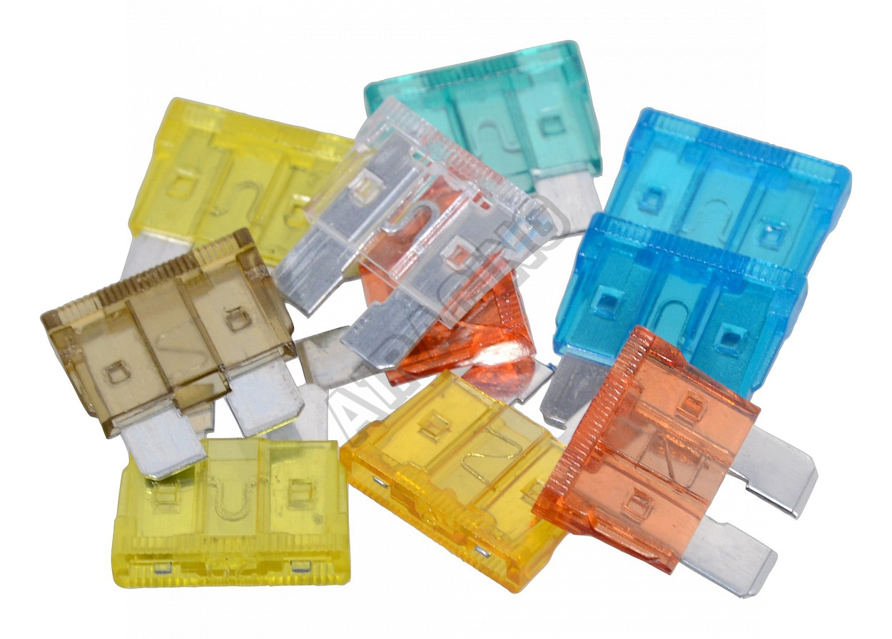 | Sada 10 kusů nožových pojistek pro použití v automobilech (max. 24V). Certifikováno (materiál: zinek / plast)