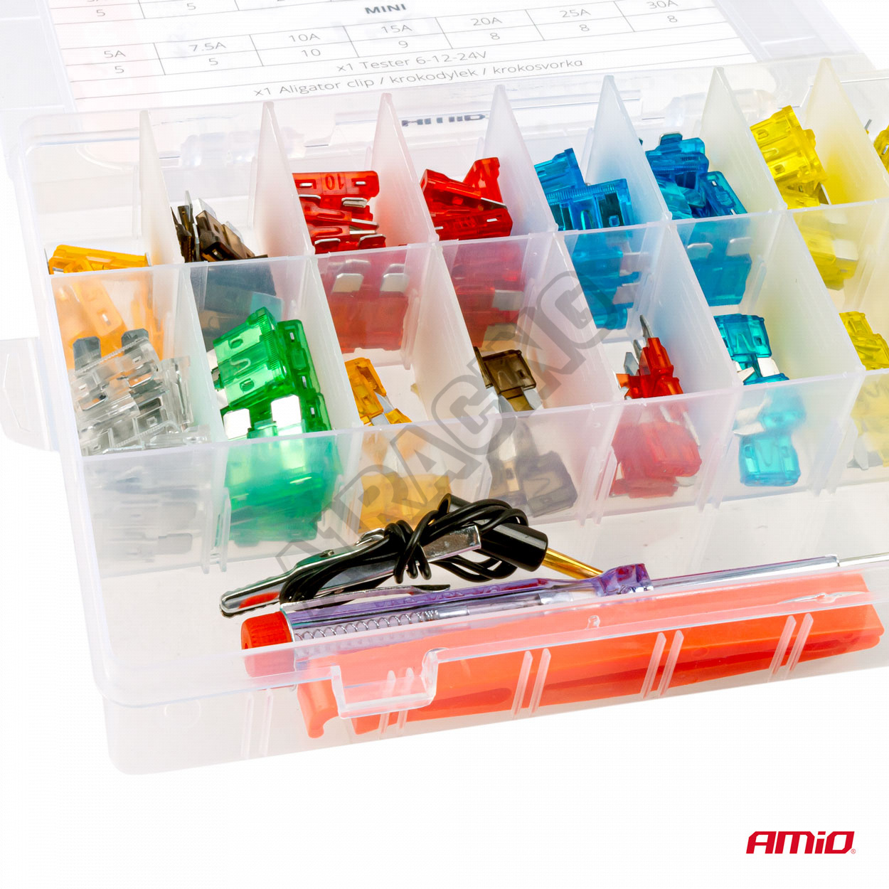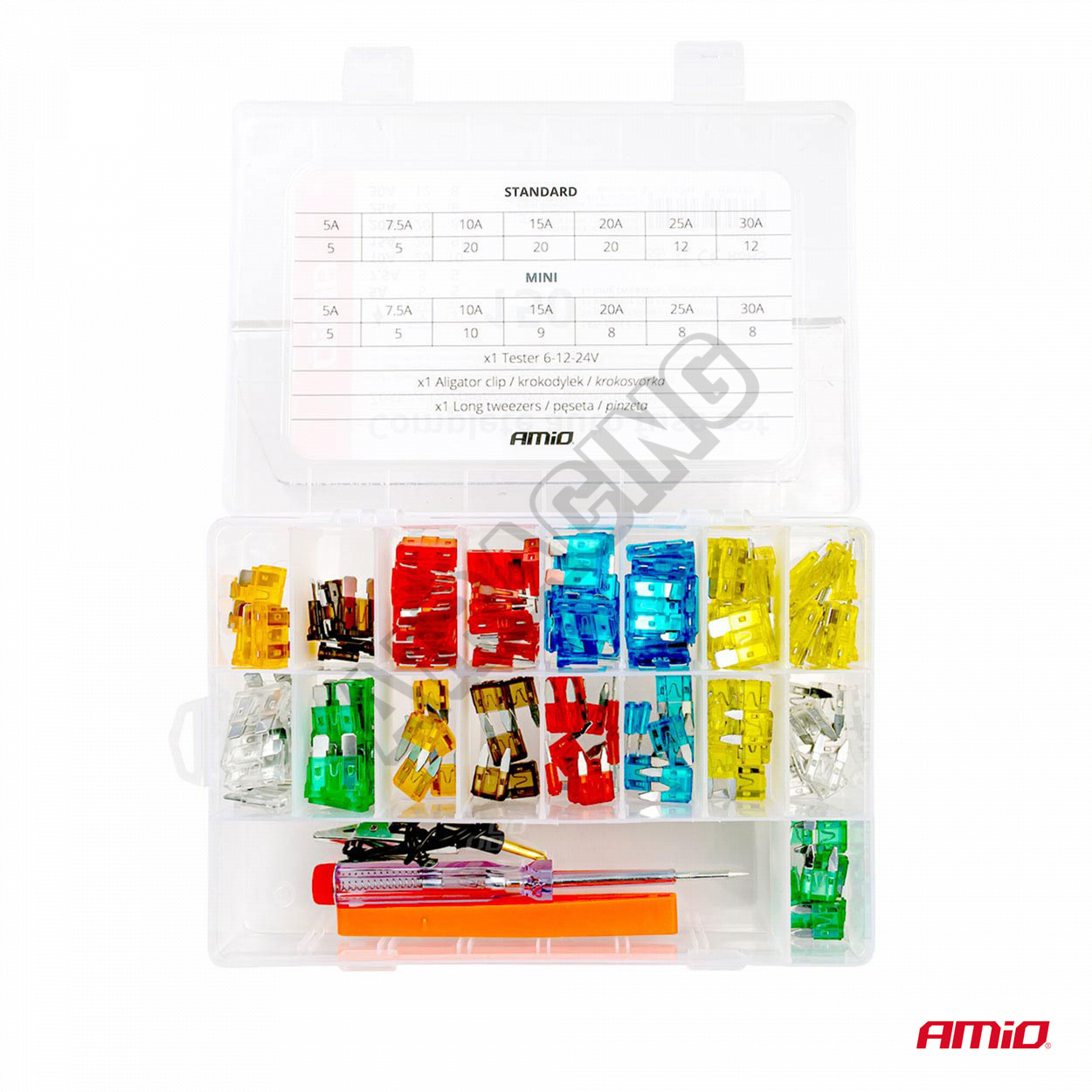 Sada plochých pojistek skládající se ze 150 kusů. Obsahuje pojistky typu mini a standard vyrobené z