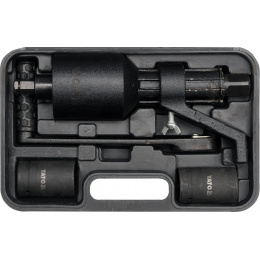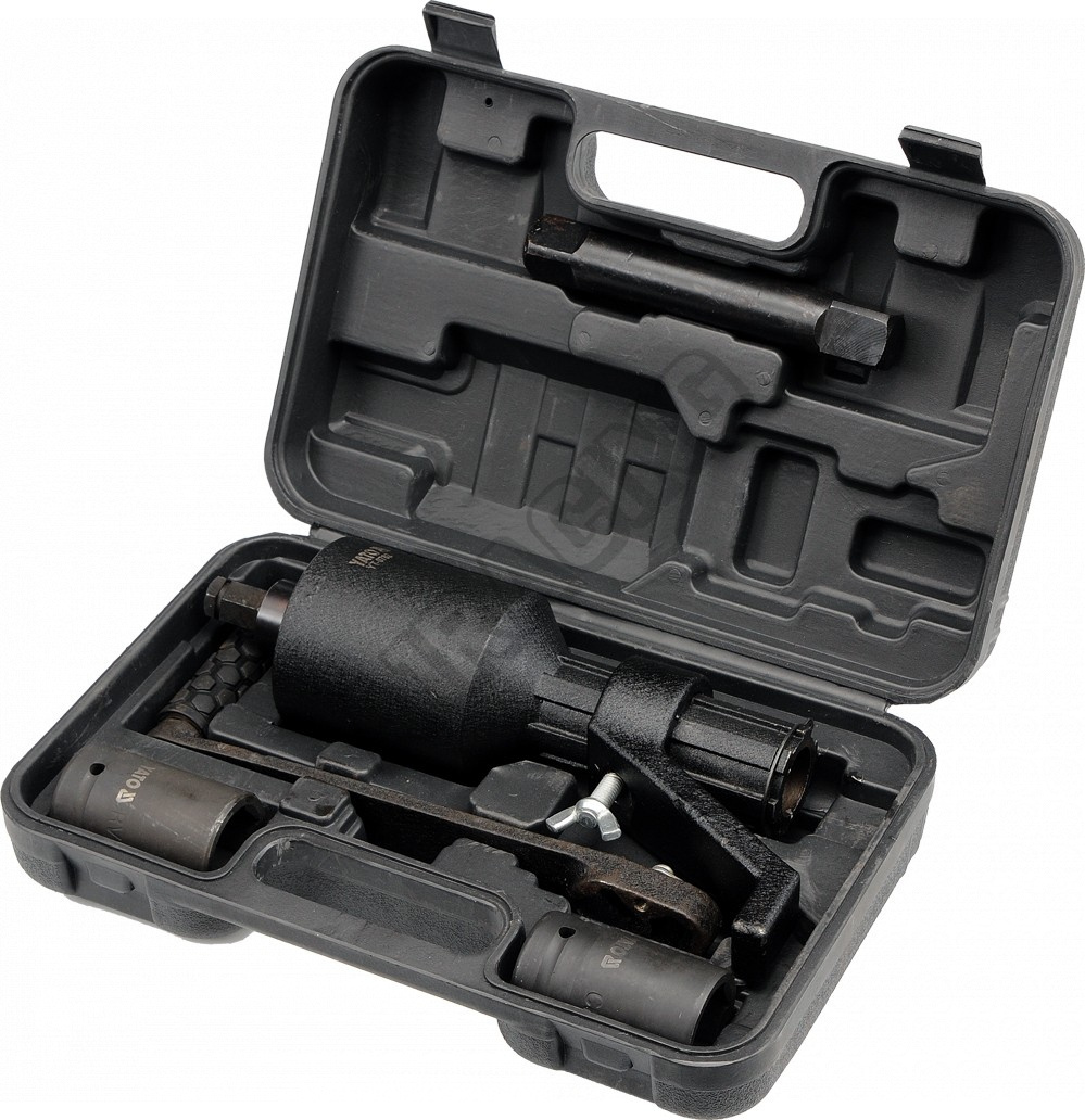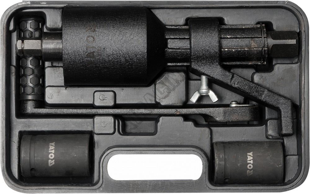 Sada je uložena v kufru, kde se nachází spolu s kovanými nástavci velikosti 32 a 33 mm, je tedy možné použít i pro sundavání kol nákladních automobilů.