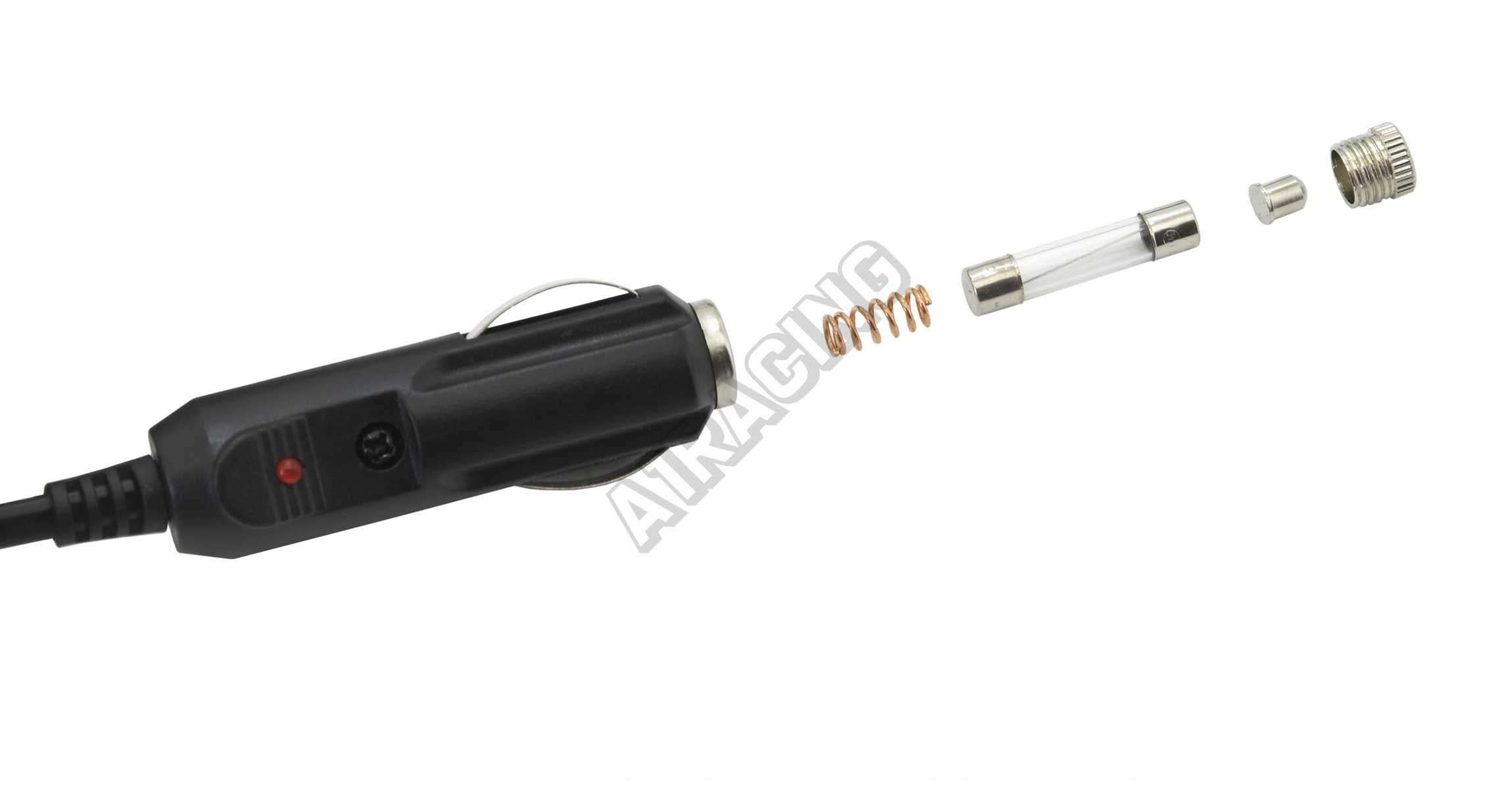 Zapojení do běžné zásuvky automobilového zapalovače 12V konektorem. Zásuvka je opatřená skleněnou pojistkou.