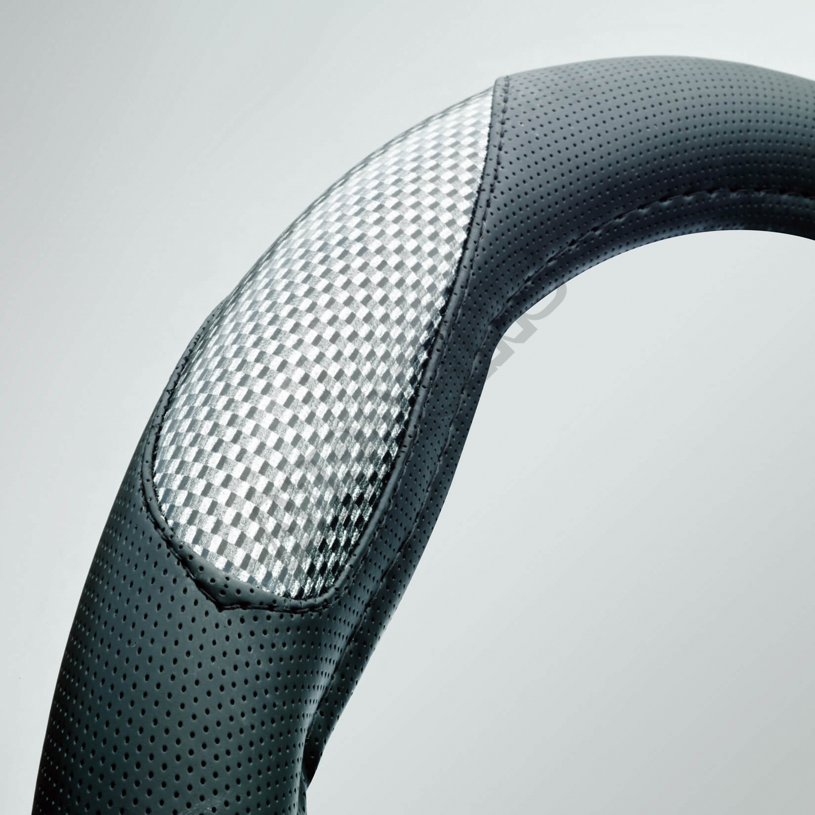 Velmi kvalitní provedení - sportovní vzhled. Tento volant je jemně děrovaný v kombinaci s imitací karbonu. V horní části je vyšité logo výrobce. Určeno pro průměr volantu 37-39 cm.