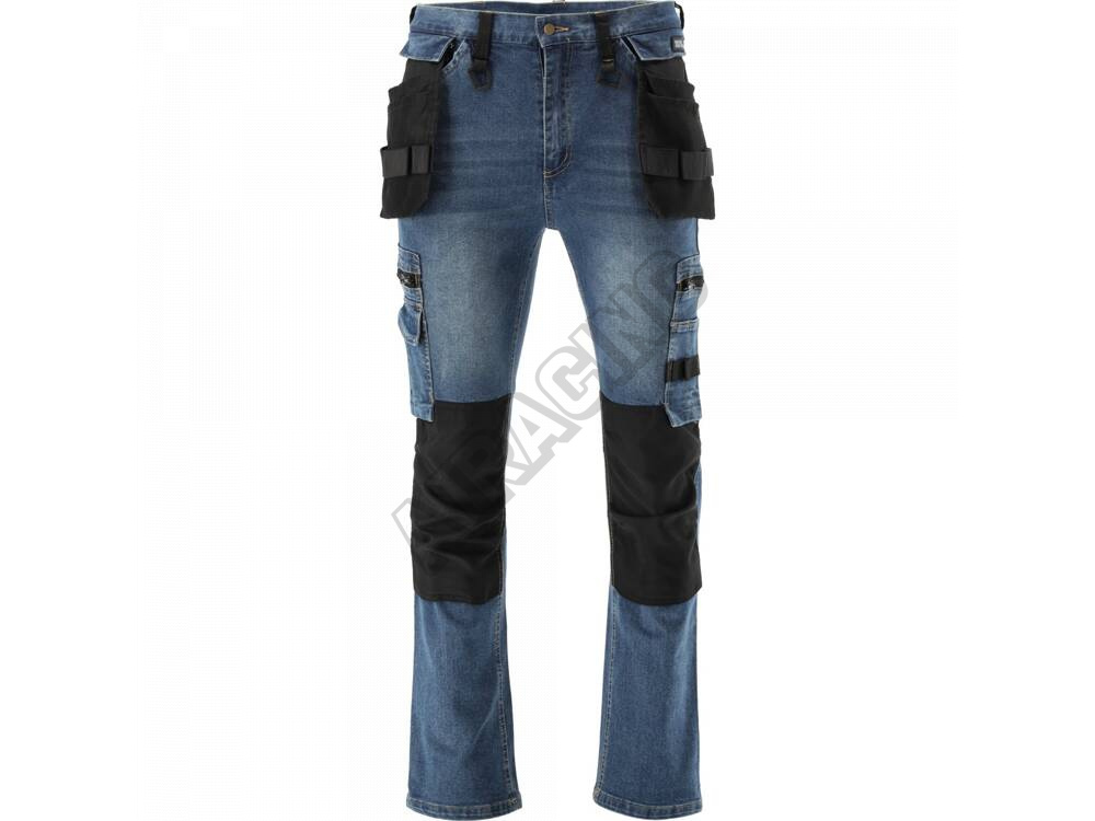 Montážní pracovní kalhoty s elastanem, vyrobené z obnošené a strečové džínoviny. Až sedmnáct kapes, včetně jedné se zapínáním na suchý zip, dvou se zapínáním na zip a dvou odnímatelných kapes pro montéra. Velké množství základních kapes a montážních kapes z odolného materiálu pomůže zorganizovat práci tesaře, pokrývače nebo klempíře.
