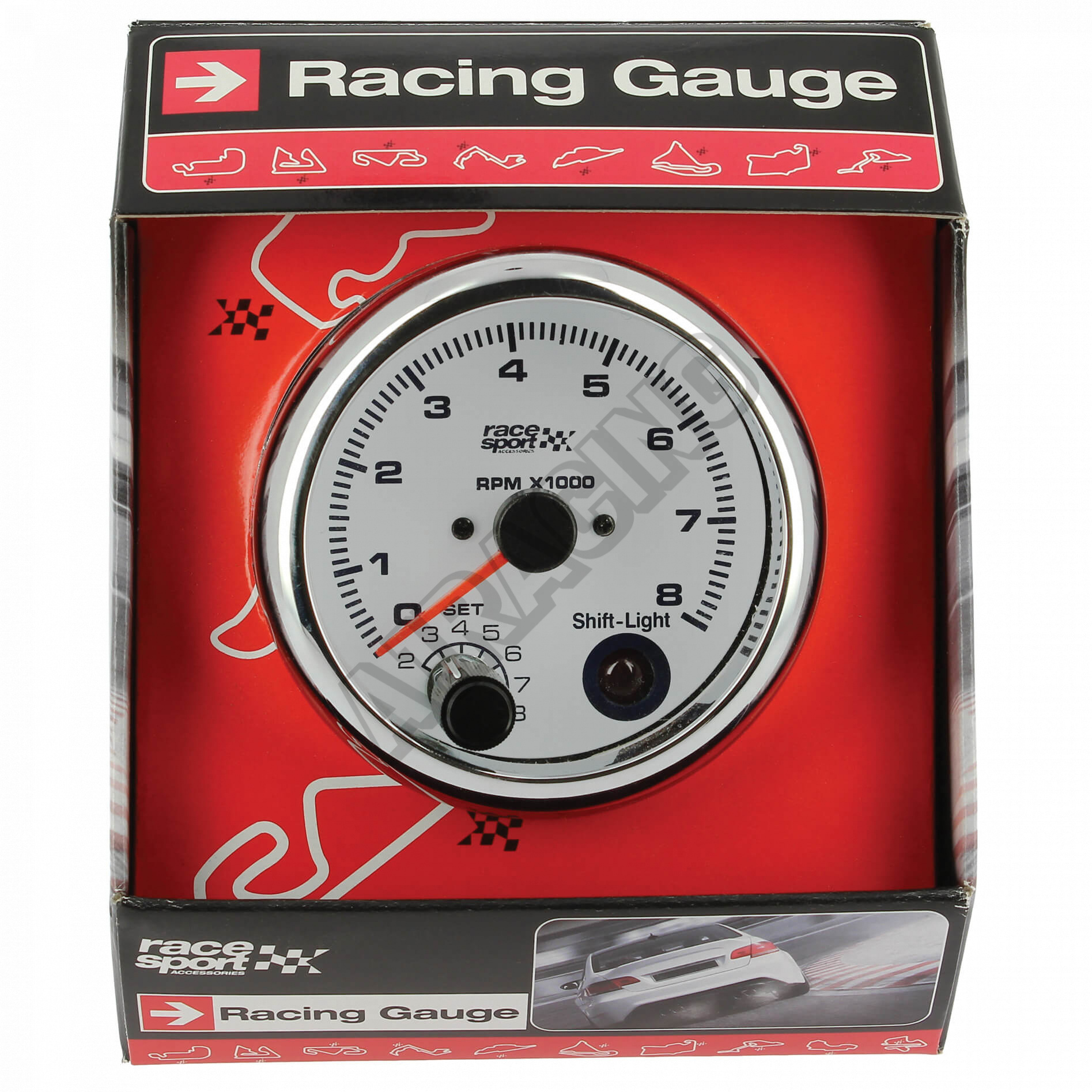 Přídavný otáčkoměr Race Sport 90 mm 0-8000 RPM - nastavitelný shift, bílý