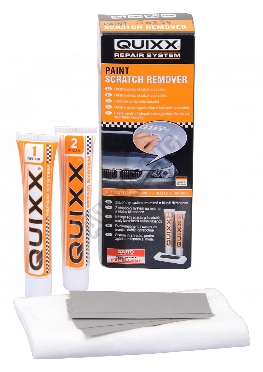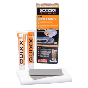 Návod na použití: naneste Quixx Polish na zasažené místo a přibližně 1 až 2 minuty jej krouživým pohybem leštěte. Zbytky pasty odstraňte vlhkým hadříkem. Quixx Finish vyleští zasažené plochy přiloženým hadříkem do vysokého lesku. Hluboké škrábance přebruste za mokra přiloženým brusným papírem. Nebrušte až na základní nátěr. V případě potřeby opakujte postup. Tato sada není vhodná pro extrémní hluboké škrábance, kde už se opravdu musí lakovat auto.