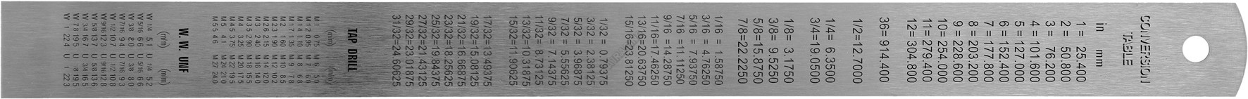 Na obou okrajích je milimetrová stupnice. Na druhé straně je převodní tabulka hodnot závitů.