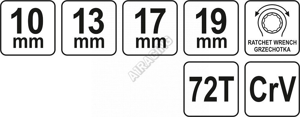 Ráčnový, oboustranný, průchozí klíč s ráčnami 10 x 13 mm a 17 x 19 mm. Klíč byl vyvinut tak, aby vyh
