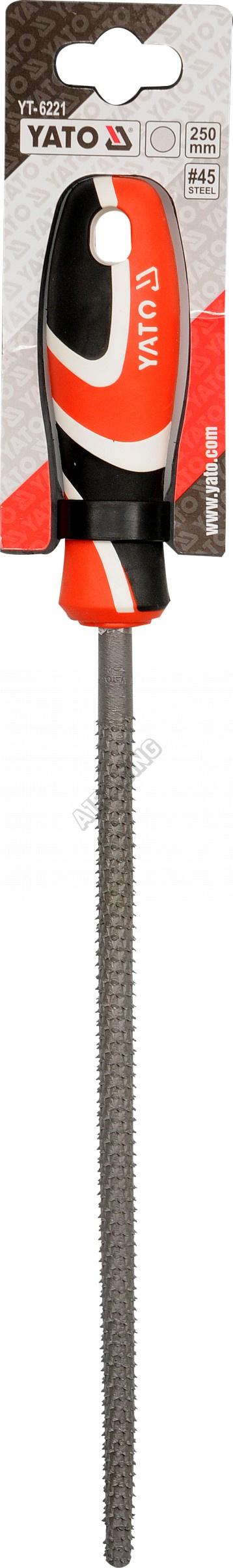 Rašple na dřevo, typ kulatá, délka 250mm, sek o hrubosti 45 pro běžné obrábění dřeva, ergonomicky tvarovaná plastová rukojeť se závěsným okem.