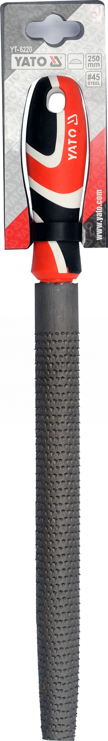 Rašple na dřevo, typ půlkulatá, délka 250mm, sek o hrubosti 45 pro běžné obrábění dřeva, ergonomicky tvarovaná plastová rukojeť se závěsným okem.