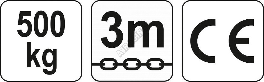 Řetěz a hák byl speciálně navržen pro výrazné zlepšení odolnosti a bezpečnosti. Ovládací řetěz má délku 2 m a výška zdvihu je 3 m. Maximální zatížení 0,5T.