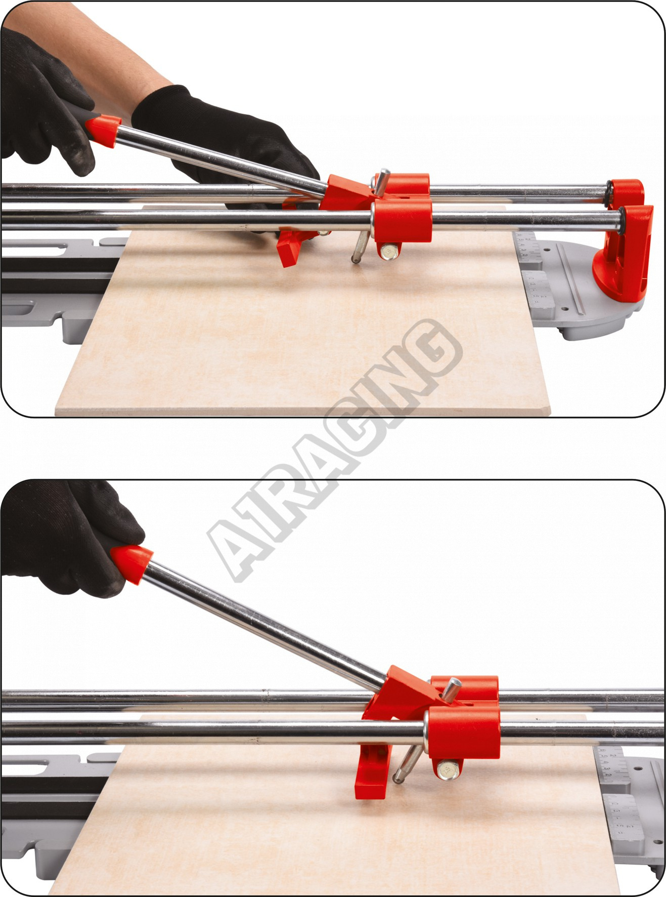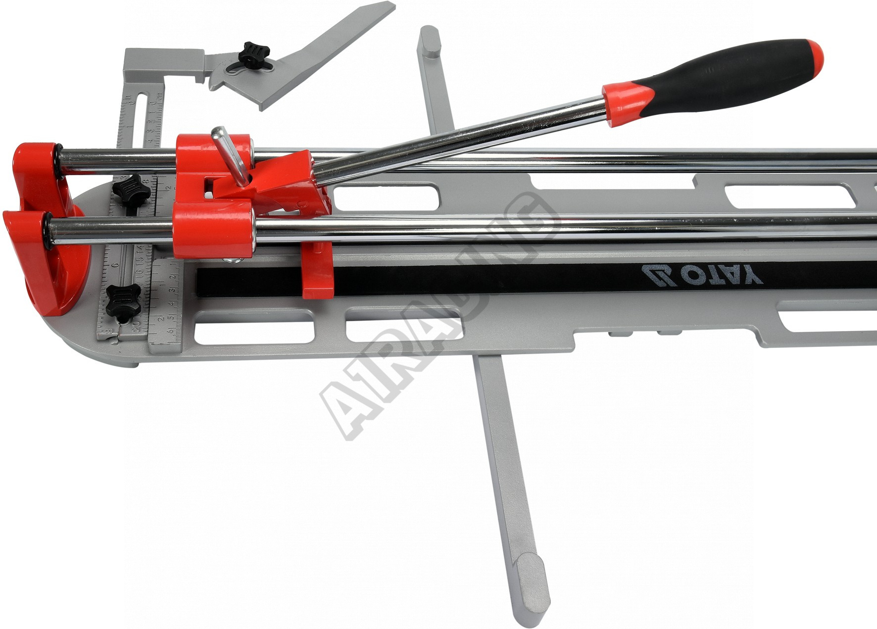 Řezačka dlaždic l-600 mm. Základna z tlakově litého hliníku s namontovanými dvěma pohyblivými podpěrami pro podporu velkých dlaždic.
